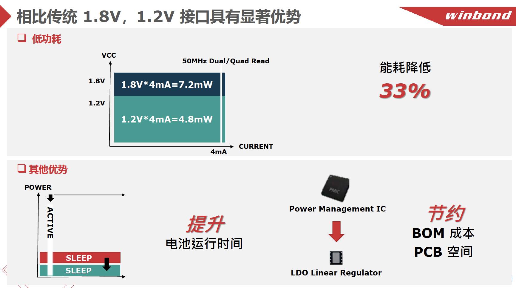 1.2V NOR Flash主要帶來(lái)兩個(gè)好處,第一是可以同步配合主芯片廠商的制程的演進(jìn),第二是帶來(lái)功耗降低。