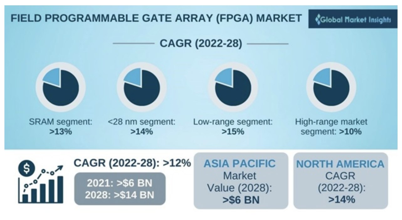 據(jù)GMI預(yù)測, 2021 年FPGA市場規(guī)模超過 60 億美元,且在 2022 年~ 2028 年間將以超過 12% 的復(fù)合年增長率增長。市場增長的動力主要來自數(shù)據(jù)中心中AI 和ML技術(shù)在邊緣計算應(yīng)用中的落地。