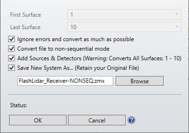 為了觀察這兩個(gè)模塊結(jié)合成為整個(gè)系統(tǒng)將如何工作,我們可以在每個(gè)系統(tǒng)中使用 “轉(zhuǎn)換至非序列模式組” 工具(可以在 文件選項(xiàng)卡…轉(zhuǎn)換至非序列模式組 中找到)來生成照明和成像子系統(tǒng)的非序列模型。在照明模塊(清除多重結(jié)構(gòu)編輯器,只保留一種結(jié)構(gòu))和成像模塊中,轉(zhuǎn)換至非序列模式組工具將使用以下設(shè)置: