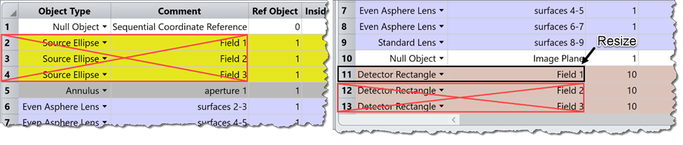 調(diào)整后,我們可以通過復(fù)制和粘貼將成像模塊物體插入到照明模塊的非序列元件編輯器中。粘貼后,我們需要確保為插入后的物體重新編號(hào) “參考物體 (Reference Object)” 參數(shù),以指向新的物體編號(hào)(如適用的話),例如我們的成像模塊光學(xué)元件現(xiàn)在需要指向組合模型中的 “物體10”(“成像模塊參考” 為空物體)。然后使用參考空物體編輯 X 位置來確定模塊的布局: