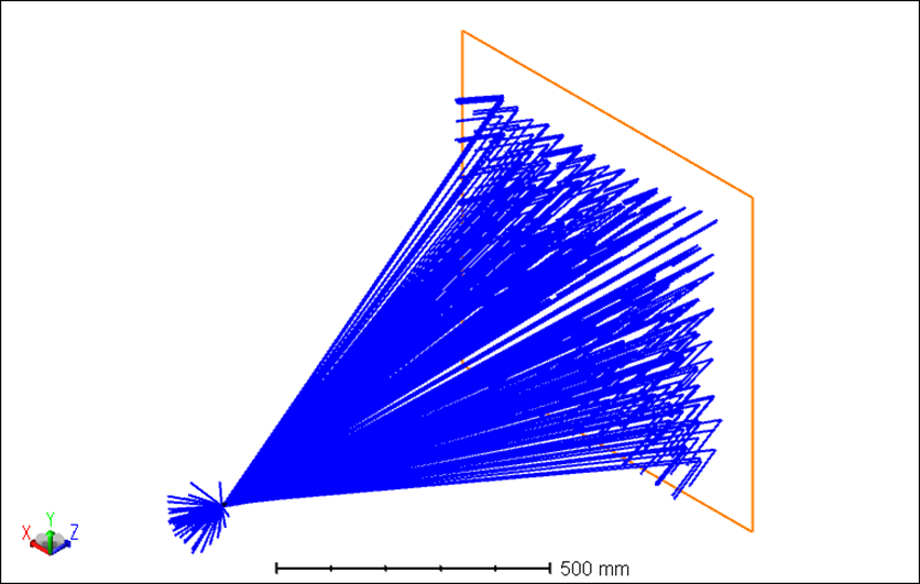 為了使壁面物體作為散射表面,在 “散射壁面” 探測(cè)器上應(yīng)用了朗伯散射配置文件。同樣,我們還通過設(shè)置 I.0 膜層(確保100%反射)和散射分?jǐn)?shù)(Scatter Fraction)值為1,使壁面成為理想的反射和散射表面。然而,在當(dāng)前定義中,由于廣角散射,散射光線很少能追跡到成像模塊。因此,重點(diǎn)采樣(Importance Sampling)可用于迫使光線向任何指定物體的頂點(diǎn)散射(參閱文章“如何利用重點(diǎn)采樣進(jìn)行高效的散射建?!?(英文原文),了解關(guān)于重點(diǎn)采樣工作原理的更多詳情)。我們將使用的目標(biāo)是 “物體11”,即成像模塊的物理孔徑,尺寸值為 0.7 mm。