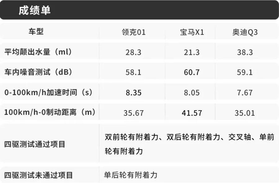 讓筆者沒想到的是,以操控出名的寶馬X1,在零百加速測試上卻輸給了奧迪Q3,更在 100km/h-0制動測試上大幅度落后奧迪Q3。而之于領克01,8.35秒的零百加速雖然稱不上快,但也是這個級別的優(yōu)秀水平。反倒是35.67米的100km/h-0制動成績,讓人沒想到。