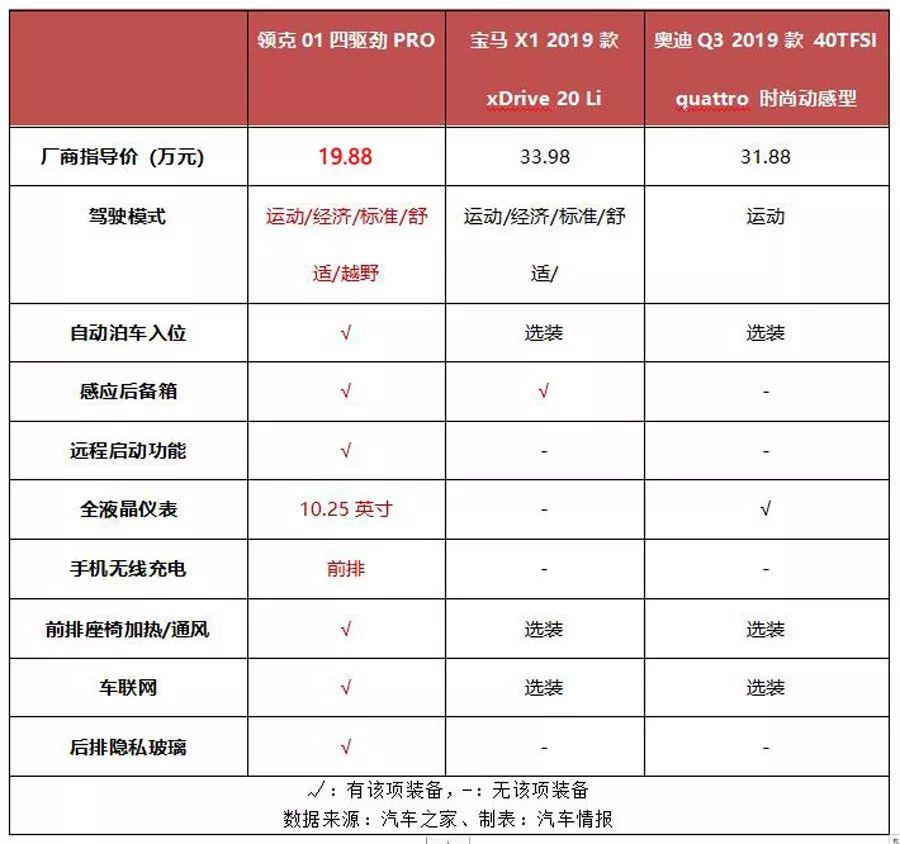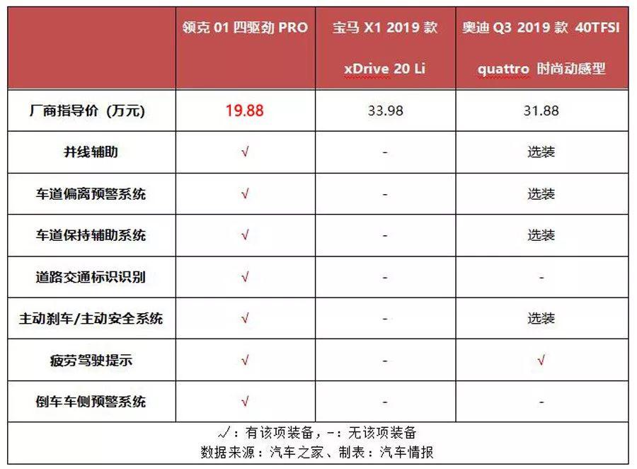 這不,對比領克01四驅勁PRO和寶馬X1 2019款 xDrive 20 Li以及奧迪Q3 2019款 40TFSI quattro 時尚動感型的安全智能科技配置的話,便能明白CMA的優(yōu)勢所在。