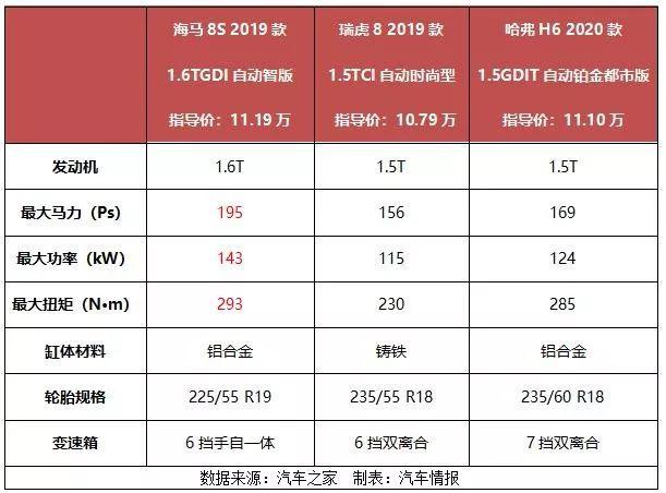 作為一款以駕乘為主的私家車,其“硬實力”顯然就是動力系統(tǒng),在這方面,三款車的表現(xiàn)如何呢?我們不妨選擇售價相差不大的海馬8S 2019款 1.6TGDI自動智版(以下簡稱海馬8S)、瑞虎8 2019款 1.5TCI自動時尚型(以下簡稱瑞虎8)、哈弗H6 2020款 1.5GDIT自動鉑金都市版(以下簡稱哈弗H6)進行對比。