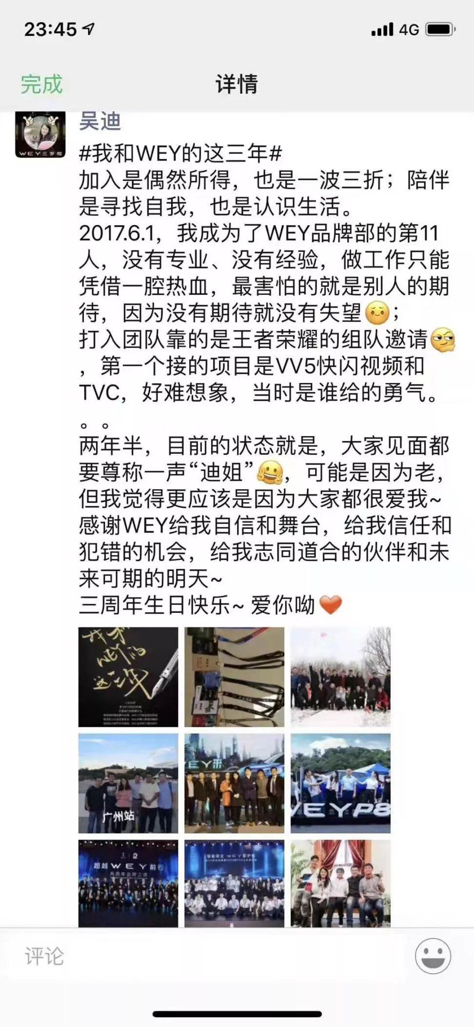 當(dāng)然,與WEY共同經(jīng)歷、互相鼓勵(lì)、共同成長(zhǎng)的不止有王子軒一位。加入WEY品牌2年半的吳迪,和小胖一樣也是“老人”,如今也被品牌部里的新人尊稱一聲“迪姐”。
