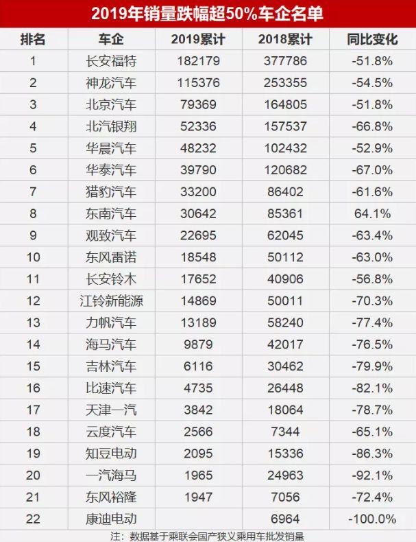 無獨(dú)有偶,就如今的汽車行業(yè)而言,不少車企也面臨著同樣困境。據(jù)乘聯(lián)會(huì)數(shù)據(jù)顯示,2019年國內(nèi)乘用車市場(chǎng)累計(jì)銷量達(dá)2069.8萬輛,同比下降7.4%,不少中小車企的降幅已經(jīng)達(dá)到70%左右,即便是位于銷量頭部的品牌,也面臨著不同程度的下滑。近日,2019年銷量跌幅超50%的車企名單公布,其中有不少合資品牌上榜,在進(jìn)一步揭露汽車行業(yè)競(jìng)爭(zhēng)激勵(lì)程度的同時(shí),也暴露出一些車企的發(fā)展境況,不少處于尾部的車企,年銷量還不到兩千臺(tái),無疑盡顯頹勢(shì)。那么,在車市兩級(jí)分化越來越嚴(yán)重的未來,它們的發(fā)展到底會(huì)更好還是更差?想必不少車主都十分關(guān)心。