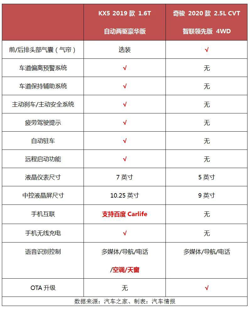 來看下方表格,在列舉到的這些主被動(dòng)安全裝備和智能科技配置上,奇駿僅比KX5多出前后排頭部氣囊(氣簾)以及OTA升級(jí)這兩項(xiàng)裝備,但在車道偏離預(yù)警系統(tǒng)、車道保持輔助系統(tǒng)、主動(dòng)剎車、疲勞駕駛提示以及自動(dòng)駐車等功能上,則全方位輸給KX5。