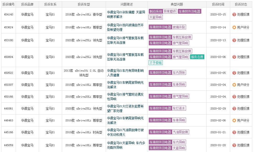 當(dāng)然,上述問題不僅出現(xiàn)在全新一代寶馬3系上面,2019款/2020款寶馬X1因為“車身附件及電器”的投訴量,也呈現(xiàn)出上漲趨勢。據(jù)第三方投訴網(wǎng)站數(shù)據(jù)顯示,僅在3月初至今的半個月中,寶馬X1因為車輛尾部/天窗異響、車內(nèi)異味、擋風(fēng)玻璃開裂等問題的投訴便多達(dá)7起,平均每兩天便有一起寶馬X1投訴,而在處理這些看似“無關(guān)緊要”的問題時,不少車主都經(jīng)歷了一波三折。