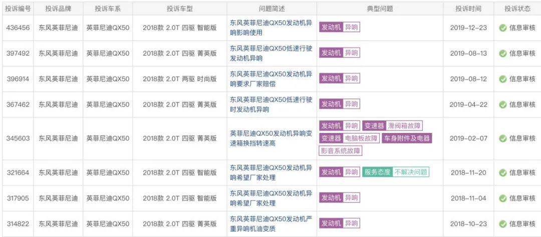 但問(wèn)題不僅存在于這一款產(chǎn)品,包括在Q50L之后上市的SUV車型QX50,依然存在著不同程度的問(wèn)題。一位不愿透露姓名的QX50車主表示,自己的愛(ài)車在提車第二天發(fā)動(dòng)機(jī)低速情況下就出現(xiàn)了明顯的“噠噠噠”聲異響,經(jīng)過(guò)和車友的交流,發(fā)現(xiàn)這樣的聲音很多車主都聽到過(guò)。但是問(wèn)及4S店時(shí),店方則表示可變壓縮比發(fā)動(dòng)機(jī)聲音就是這樣的,但車主對(duì)此答復(fù)表示不認(rèn)同。 但這樣的問(wèn)題,并非這位QX50車主個(gè)例。比如這位同樣來(lái)自西安的QX50車主,車子是2018年9月份在西安浐灞英菲尼迪4S店購(gòu)買的。車子沒(méi)開幾個(gè)月,就出現(xiàn)了加速時(shí)發(fā)動(dòng)機(jī)艙內(nèi)嚴(yán)重異響,至今仍未得到解決。