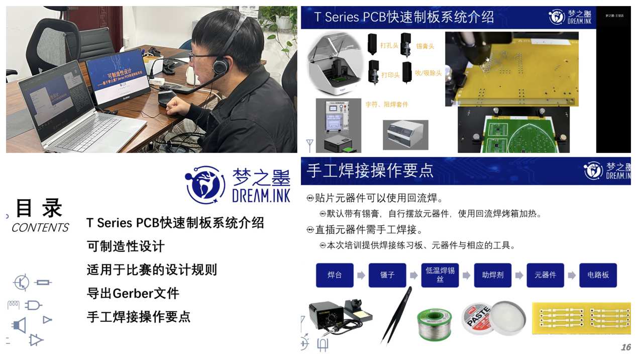 賽前,為了讓選手們更好更高效的完成比賽,夢之墨通過在線直播的形式安排了詳盡的賽前培訓(xùn),主要內(nèi)容包含PCB快速打印系統(tǒng)、電路可制造性設(shè)計(jì)、電路焊接等,使參賽選手們充分學(xué)習(xí)了解了電子增材制造技術(shù)及工藝,。