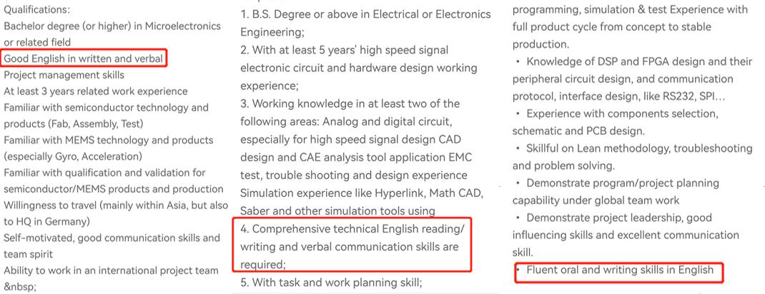 毫無(wú)疑問,當(dāng)今電子行業(yè)站在世界前列的仍然是國(guó)外。工程師在做硬件設(shè)計(jì)的時(shí)候,需要閱讀大量的外文資料。有的工程師英語(yǔ)基礎(chǔ)薄弱,閱讀的時(shí)候使用翻譯軟件逐行翻譯,效率很低。你如果精通英文,可以直接閱讀世界上先進(jìn)的技術(shù)文檔,用流利的口語(yǔ)與世界各地的工程師對(duì)話,在專業(yè)和職業(yè)上得到的機(jī)會(huì)也會(huì)更多。