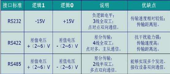 針對異步串行通信的接口標準有RS232、RS422、RS485,其對比區(qū)別如下: