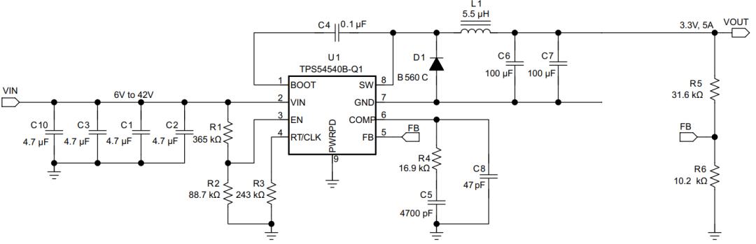 TPS54540 器件在 SW 引腳和 GND 之間需要一個外部鉗位二極管。