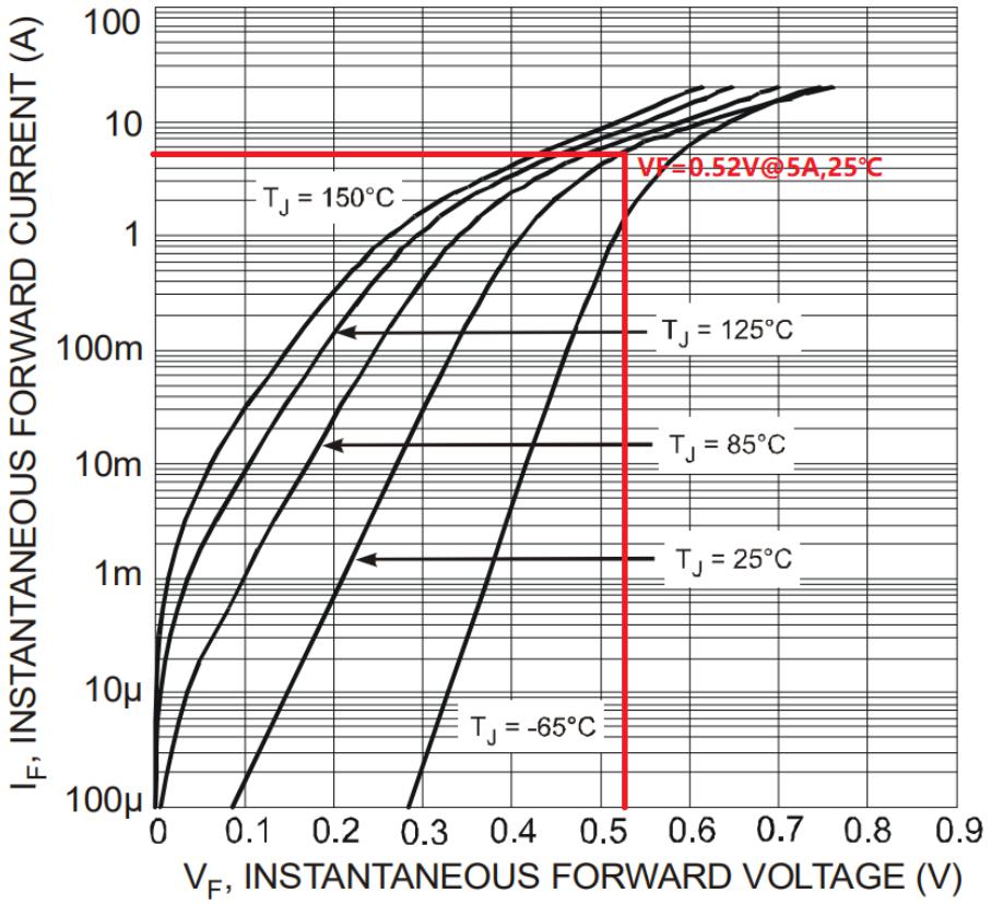 PDS760-13的典型正向電壓在5 A和25℃時為0.52 V,導(dǎo)通壓降較小,符合要求。