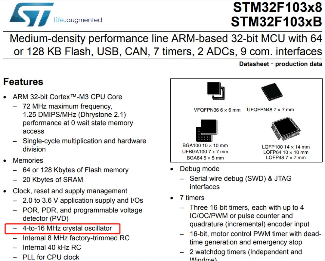 下載STM32F103 datasheet,Page1 找到與晶振相關(guān)的參數(shù),時(shí)鐘頻率4~16MHz;