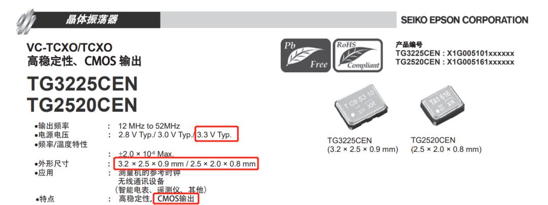 無線通信應(yīng)用中,以EPSON TG3225/TG2520為例,晶振頻率選擇25MHz.封裝可選2520或者3225,CMOS輸出,電源電壓3.3V。
