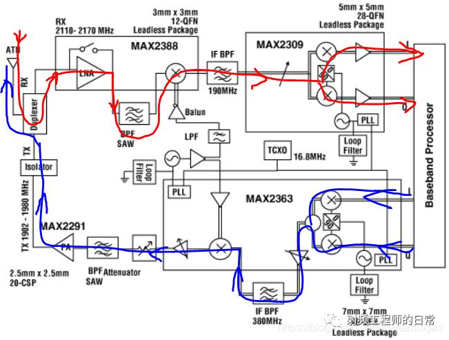 射頻通信主要依靠發(fā)射機(jī)和接收機(jī)。射頻發(fā)射機(jī)需要注意的是功率的推動放大,預(yù)放推末前級,末前級推末級,注意由于增益過高而引起放大器自激,此時(shí)已經(jīng)不穩(wěn)定,設(shè)計(jì)時(shí)需要在中間加一些衰減,末級甚至末前級加隔離器的方法,有條件可以利用腔體隔開,留夠足夠的裕度。以WCDMA為例,下圖藍(lán)色線條描述的是發(fā)射機(jī)信號行進(jìn)路線,基帶信號I,Q(有用信息攜帶者)兩路經(jīng)過MAX2363內(nèi)部的IQ調(diào)制器合成一路信號,然后通過可調(diào)增益放大器(VGA)放大信號,接著依次通過中頻帶通濾波(BPF),混頻(上變頻),放大器,衰減器,聲表濾波器,功率放大器,隔離器,雙工器,最后通過天線將信號發(fā)射出去。下圖紅線描述的是接收機(jī)信號的行進(jìn)路線,和發(fā)射機(jī)對比,就是信號的解調(diào)過程;天線接收空中信號,依次通過雙工器,低噪聲放大器(LNA),帶通濾波器(BPF),混頻器(下變頻),濾波器,IQ解調(diào)器,最后進(jìn)行基帶處理。下文主要講接收機(jī)的架構(gòu),后續(xù)有時(shí)間會慢慢寫接收機(jī)系統(tǒng)設(shè)計(jì),系統(tǒng)噪聲計(jì)算,實(shí)際設(shè)計(jì)場景中應(yīng)考慮到的問題,所遵循的法規(guī)標(biāo)準(zhǔn),以及VCO、PLL、低噪放、功率放大器、濾波器等一些基本射頻單元的仿真設(shè)計(jì)以及PCB layout驗(yàn)證,PCB射頻layout注意事項(xiàng),調(diào)試經(jīng)驗(yàn)分享。