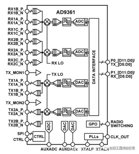 零中頻軟件無線電芯片已經(jīng)非常流行,AD9361是ADI推出的面向3G和4G基站應(yīng)用的高性能、高集成度的射頻解決方案。該器件集RF前端與靈活的混合信號基帶部分為一體,集成頻率合成器,為處理器提供可配置數(shù)字接口。AD9361接收器LO工作頻率范圍為70 MHz至6.0 GHz,發(fā)射器LO工作頻率范圍為47 MHz至6.0 GHz,涵蓋大部分特許執(zhí)照和免執(zhí)照頻段,支持的通道帶寬范圍為200 kHz以下至56 MHz。