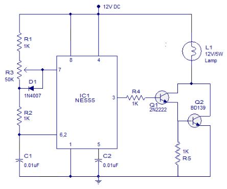 前幾天測試電源負載跳變的時候,用到了555定時器,主要用來產(chǎn)生頻率并控制占空比,好久沒看這部分電路,也忘的差不多了,去網(wǎng)上搜了一下相關(guān)知識,就和大家聊聊。這是一款利用NE555進行調(diào)光的電路,如下圖所示,R1、R2、R3和C1決定了定時器的參數(shù),3腳Output輸出的占空比可以使用R3進行調(diào)整,占空比越高表示燈的亮度越高,占空比越低表示燈的亮度越低。