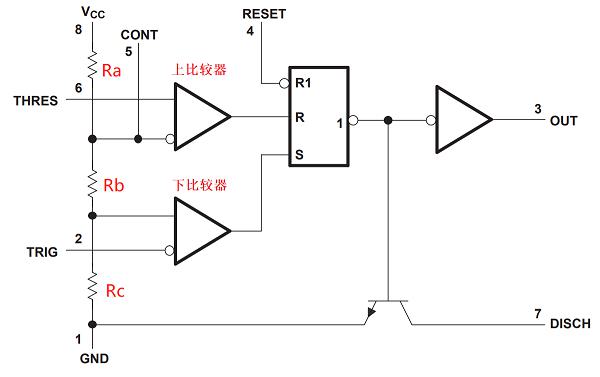 由于內(nèi)部觸發(fā)器作用,電容器放電經(jīng)過R2,Ry,當C1的電壓下限變?yōu)?/3Vcc時,下比較器發(fā)生翻轉(zhuǎn),進而使內(nèi)部觸發(fā)器切換其輸出。此時NE555輸出高,Toff=0.67(R2+Ry)*C1。