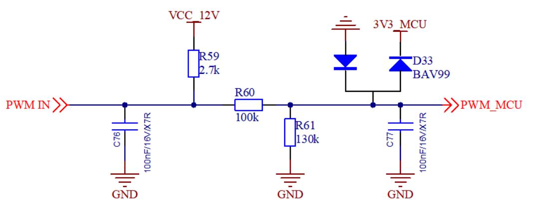 和同事一起進(jìn)行原理圖評審的時候,他提出來PWM輸出信號是開漏輸出的,于是電路又變成了這樣,有了后級的鉗位,電阻分壓就可以大點;