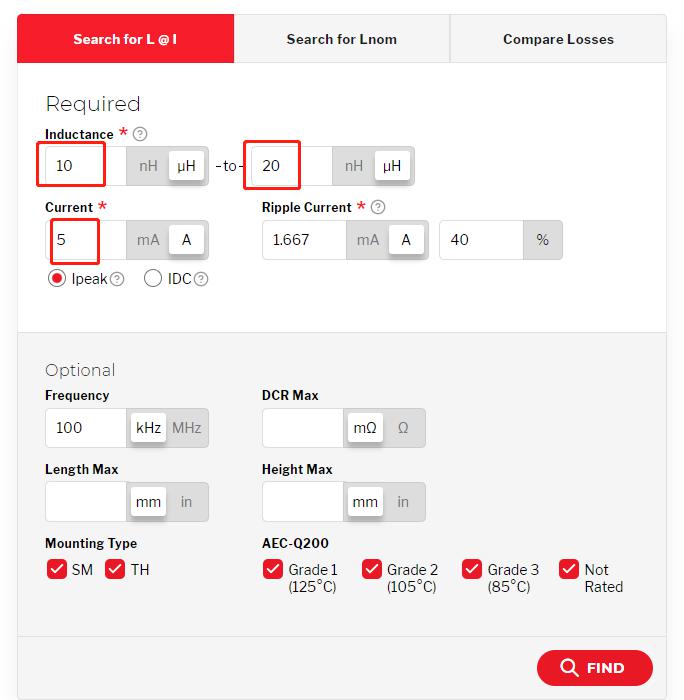 可以看到計(jì)算器工具提供了2種搜索方法,一種是基于工作電流的,還有一種是基于感值的,選擇第一種試試看,感值范圍10uH-20uH,電流5A,紋波系數(shù)默認(rèn)40%,開關(guān)頻率可選100kHz(為了后面的交流損耗計(jì)算,需要提供頻率)。
