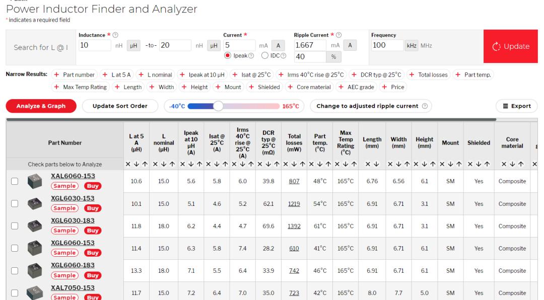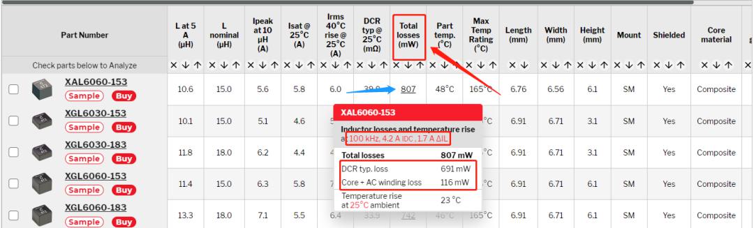 我現(xiàn)在只對(duì)電感的損耗感興趣,這時(shí)在參數(shù)欄發(fā)現(xiàn)了Total losses,第一個(gè)XAL6060-153電感損耗是807mW,這樣不用計(jì)算就能得到我想要的答案了,還有另一種按照感值搜索的方法,大家可以自己嘗試一下。
