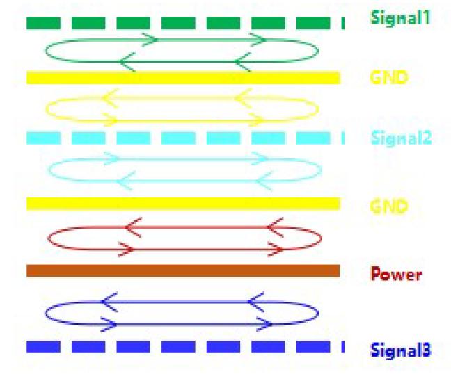 PCB 疊層設(shè)計(jì)的總原則是高頻信號(hào)具有完整的參考地平面,高頻信號(hào)環(huán)路面積最小,第一是電源層緊鄰參考地平面使得電流泄放快,第二是環(huán)路面積小使得感應(yīng)電流的能力相應(yīng)減弱。