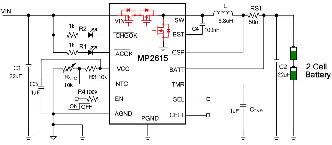 最近正好在用開關(guān)式充電芯片MP2615GQ,下圖是2節(jié)4.2V鋰電池的應(yīng)用電路和官方DEMO板。