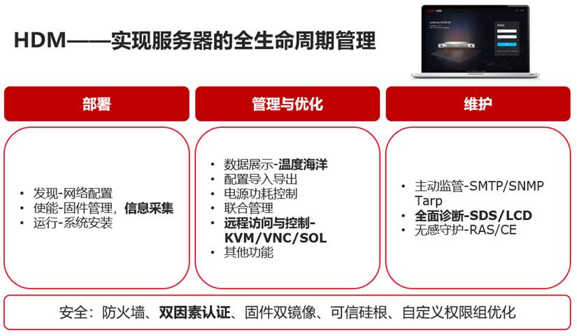 這里介紹一下H3C UniServer服務器BMC管理平臺-硬件設備管理系統(tǒng)(Hardware Device Management,以下簡稱HDM),HDM是H3C UniServer服務器內(nèi)置的軟硬件一體的嵌入式管理系統(tǒng),提供對服務器硬件設備的全生命周期的監(jiān)、管、控,能幫助客戶實現(xiàn)更智能的服務器運維和更高效的全生命周期管理。