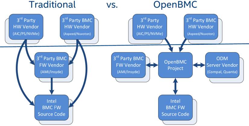 當前服務器BMC固件主要是由傳統(tǒng)的IBV廠商提供支持和服務,需要向IBV廠商支付codebase、new feature、license等費用。全球top的云服務/云計算廠商為了降低BMC固件資本支出及BMC固件開源生態(tài)的促進,也在積極推進各大服務器OEM/ODM生態(tài)廠商融合參與一些開源BMC固件解決方案的導入,共同推進BMC固件相關新技術和新產(chǎn)業(yè)的發(fā)展,其中最有影響力的當屬OpenBMC開源固件。