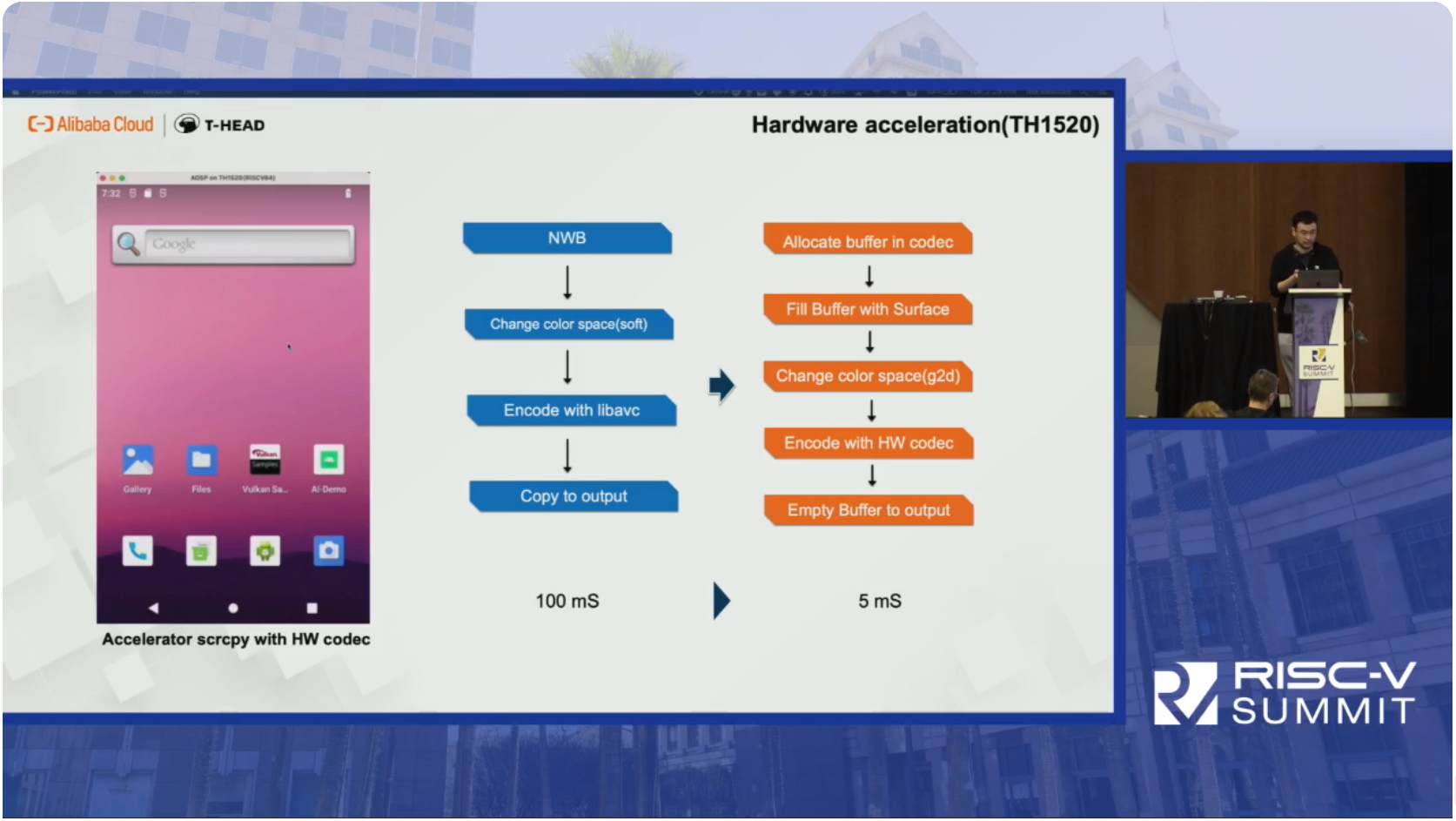 基于曳影1520,平頭哥實(shí)現(xiàn)了從底層硬件到安卓系統(tǒng)再到上層應(yīng)用的完全打通,相關(guān)成果demo在2022 RISC-V國(guó)際峰會(huì)上首次演示:一個(gè)demo視頻演示多路編解碼能力,編碼時(shí)長(zhǎng)從每幀100ms大幅壓縮到5ms;另一個(gè)demo演示高性能3D渲染,提升了兩大體系融合的性能天花板。