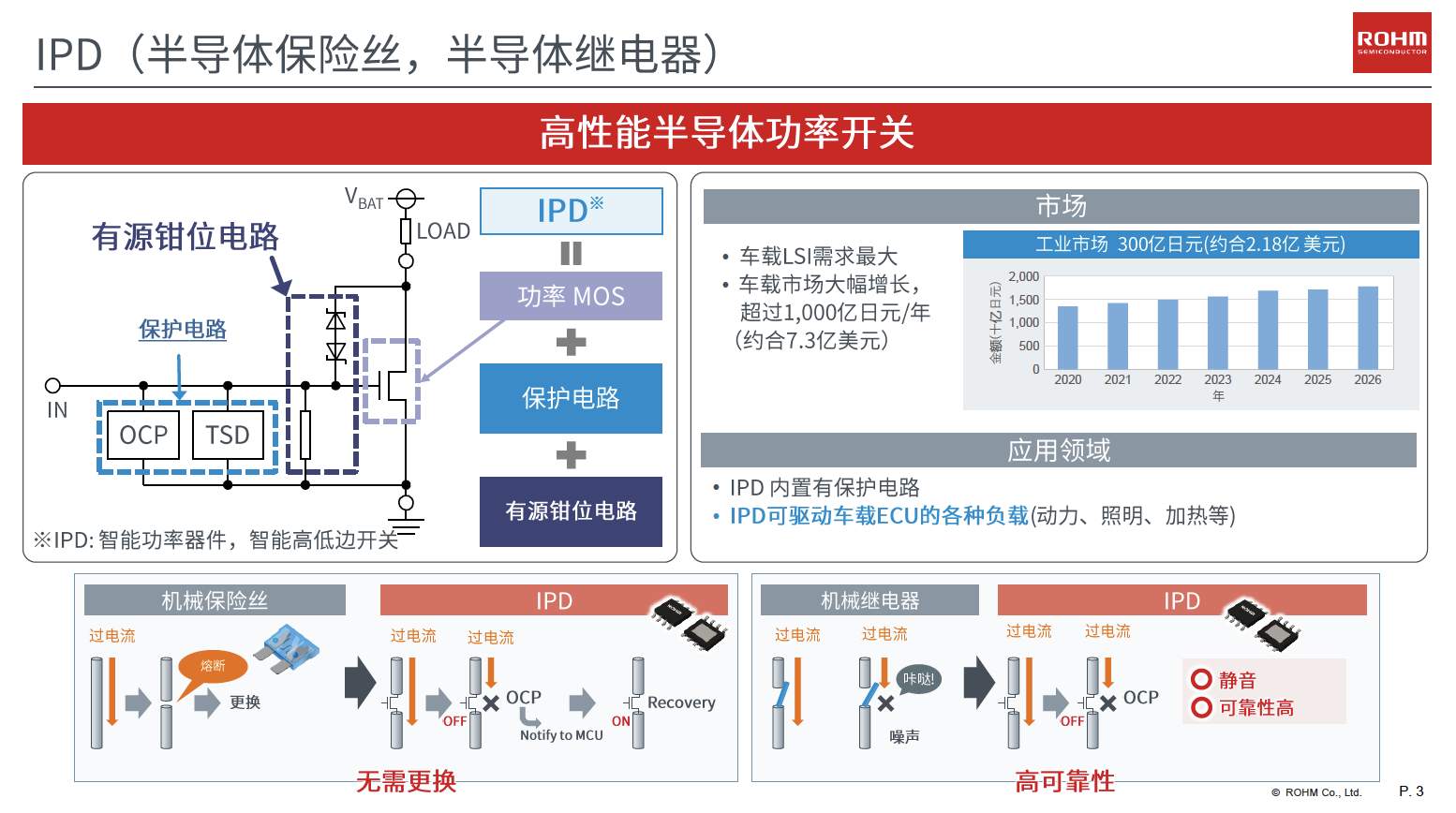 IPD工藝是采用了專用的BV生產(chǎn)線,將溝槽MOS和CMOS集成于一枚芯片中,當前市面上包含ROHM在內(nèi)只有三家具備這樣的工藝。在IPD的電路設計上,ROHM追求易用性,開發(fā)了多種不同的功能,包括雙重故障反饋、可調(diào)限流和壓擺率控制。IPD在功率封裝上,通過固晶材料改良,滿足了車載的需求以及功率器件散熱性的要求。