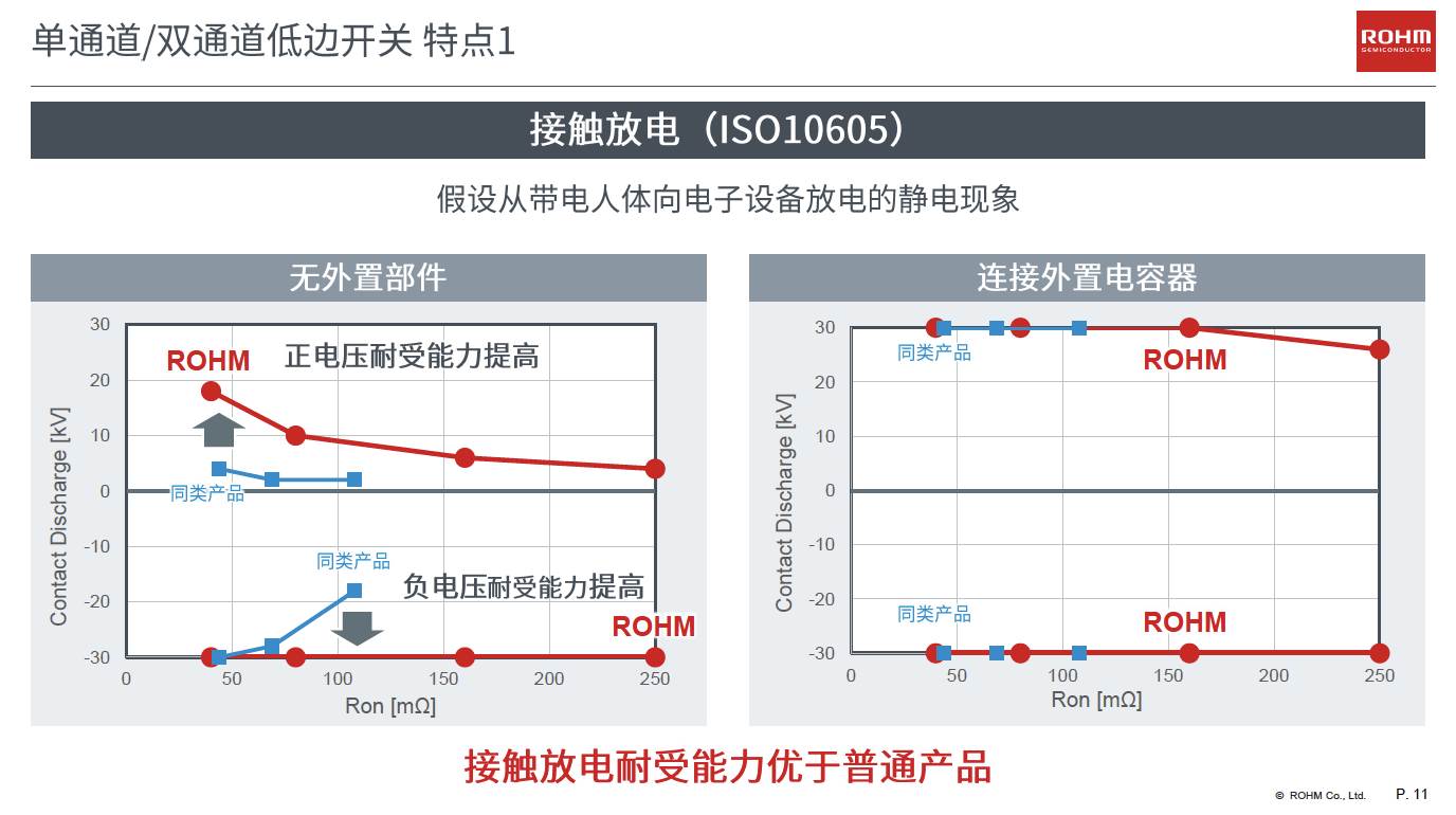 “接觸放電耐受能力強”是該系列產(chǎn)品的一大特點,如下圖所示,在無外置器件的條件下,ROHM該系列產(chǎn)品相較普通產(chǎn)品,不論是正電壓耐受能力還是負電壓耐受能力,均有明顯提高。