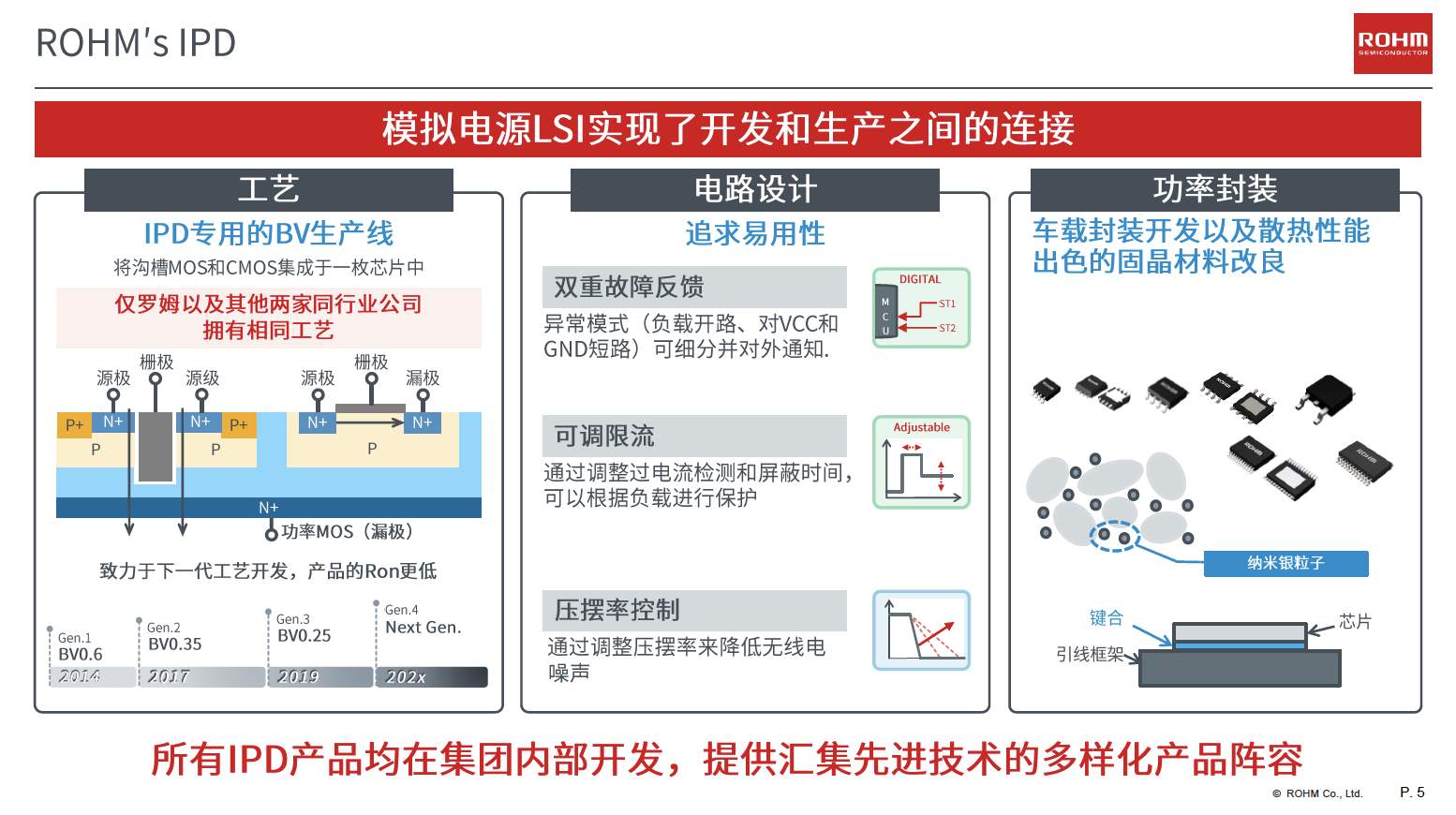 對于功率器件而言,工藝、設計和封裝都同樣重要。ROHM一直以來都是垂直整合型的生產(chǎn)體制,IPD產(chǎn)品也凝聚了工藝、電路設計、功率封裝幾大技術優(yōu)勢。