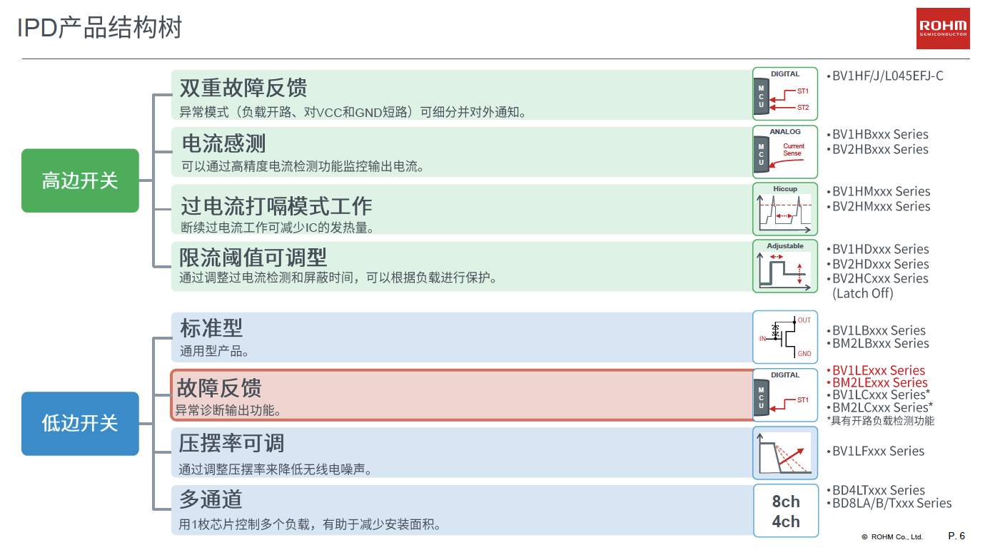 ROHM的IPD產(chǎn)品分為高邊開關和低邊開關兩大類,如下圖所示,每一大類又根據(jù)產(chǎn)品功能側(cè)重不同分為四個小的類別。而在此次發(fā)布會上介紹的新品BV1LExxxEFJ-C/BM2LExxxFJ-C,則是具備故障反饋功能的底邊開關IPD產(chǎn)品。