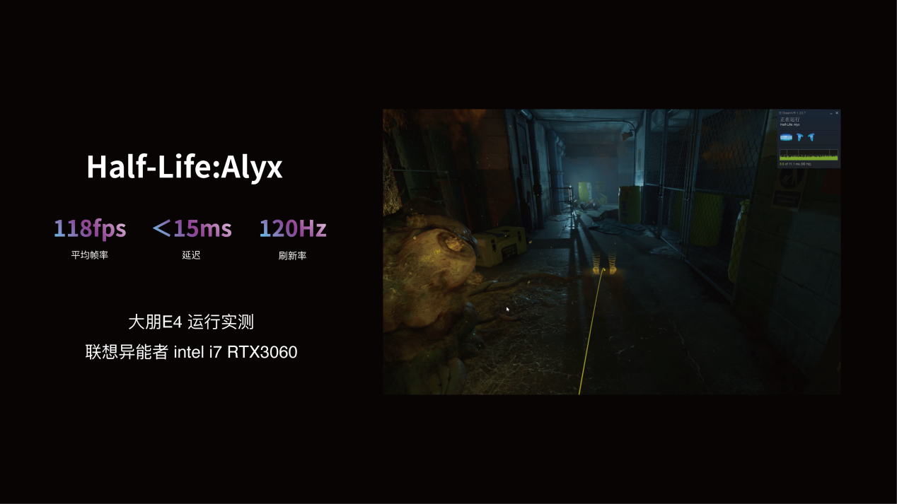 多方加持下,大朋VR E4可以保證3A游戲大作都能流暢運行,例如VR神作《半條命:艾利克斯》就能夠穩(wěn)定達(dá)到118fps和120Hz刷新率。