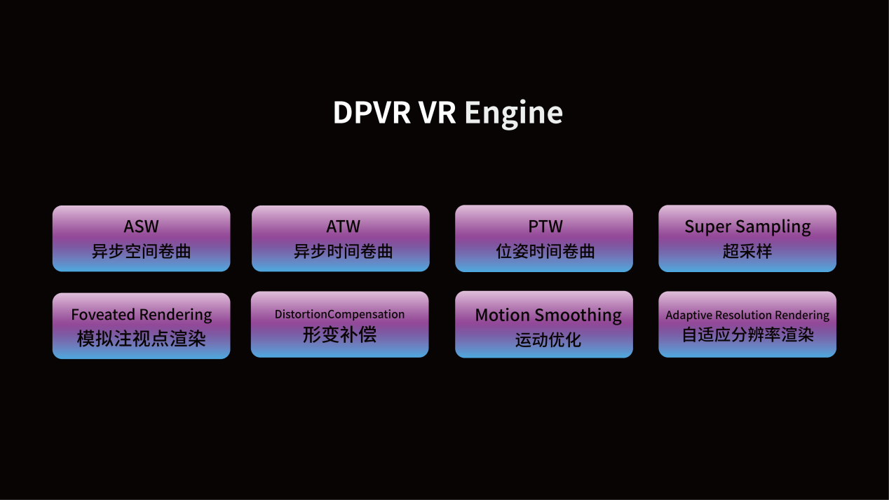 答案是肯定的。大朋VR CEO陳朝陽介紹道,大朋在PC VR領(lǐng)域有7年的技術(shù)積累,在性能調(diào)教上有許多不同的算法方案,如ASW、ATW、PTW、超采樣算法、模擬注視點渲染等等,能夠有效降低延遲、提高內(nèi)容清晰度;而ASW與Super sampling超采樣算法結(jié)合,還能顯著降低對顯卡性能的要求,有效防止掉幀現(xiàn)象的產(chǎn)生。