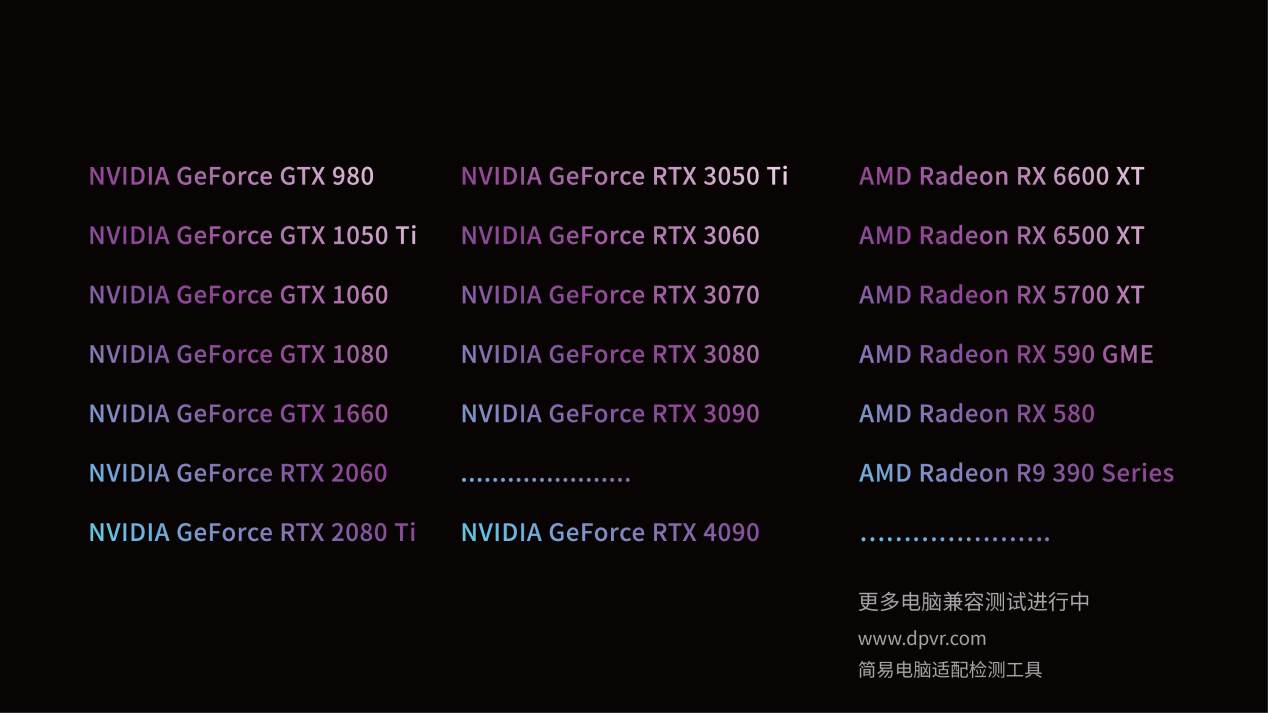 大朋VR在調(diào)研時發(fā)現(xiàn),許多玩家苦于不同硬件對不同顯卡的兼容問題。為此,大朋VR與英偉達(dá)、AMD兩大顯卡供應(yīng)商達(dá)成戰(zhàn)略合作,做了大量測試,最終在E4上實現(xiàn)了適配所有顯卡。