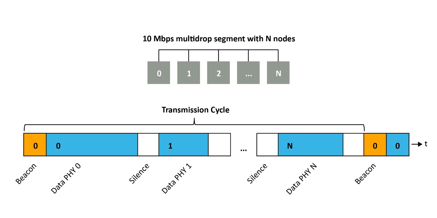 除了最大傳輸距離之外,10BASE-T1S和10BASE-T1L之間還有兩個主要區(qū)別。首先,只有10BASE-T1S提供多點通信和點對點連接能力。其次,只有10BASE-T1S采用了物理層防沖突(PLCA),這是在汽車、工業(yè)和樓宇自動化等需要固定性能的實時應(yīng)用中使用時的關(guān)鍵要素。PLCA專門設(shè)計用于10BASEase-T1S等半雙工、多點通信網(wǎng)絡(luò),并且避免了多點通信混合段中發(fā)生載波偵聽多路訪問與沖突檢測(CSMA/CD)問題。
