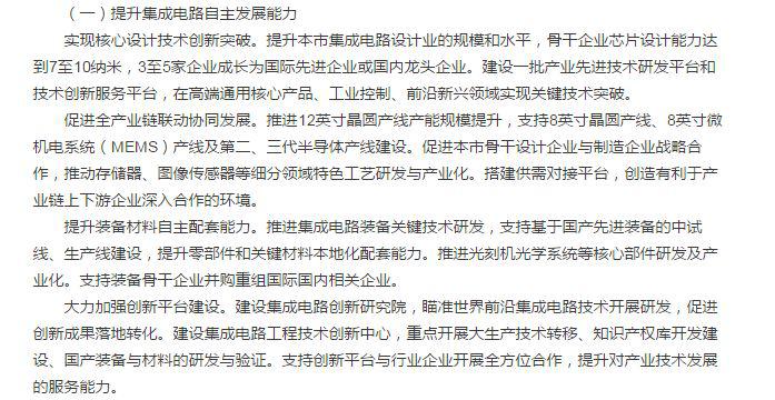 在北京市人民政府的官網(wǎng)里,筆者依舊沒搜到具體數(shù)值。2017年出臺的《北京市加快科技創(chuàng)新發(fā)展集成電路產(chǎn)業(yè)的指導(dǎo)意見》中提到的都是相關(guān)技術(shù)的細節(jié)目標。在主要任務(wù)中的“提升集成電路自主發(fā)展能力”這一欄,囊括了設(shè)計能力、全產(chǎn)業(yè)鏈協(xié)同發(fā)展、裝備材料、平臺建設(shè)(集成電路任務(wù)細則如下圖)。大的方向,還有人工智能、大數(shù)據(jù)、云計算、網(wǎng)絡(luò)空間安全和5G。