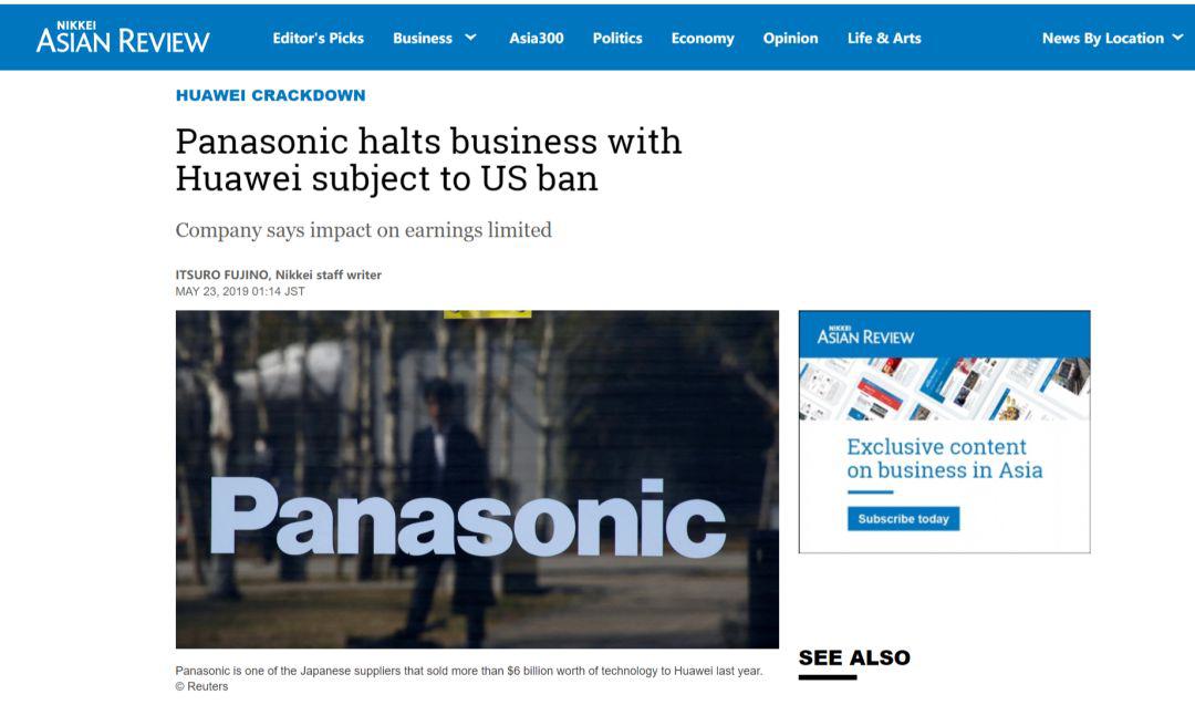 《日經(jīng)亞洲評(píng)論》(Nikkei Asian Review)報(bào)道,日本松下電器產(chǎn)業(yè)公司(Panasonic Corp., 6752.TO)周三決定,暫停向華為技術(shù)有限公司(Huawei Technologies Co.)提供某些零部件,此前美國(guó)發(fā)布了針對(duì)這家中國(guó)電信設(shè)備制造商的出口禁令。