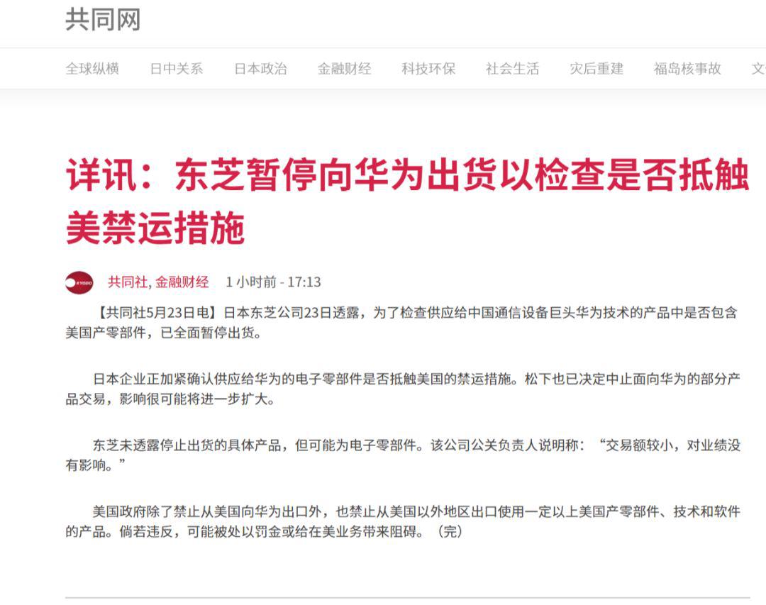 5月23日,共同社報(bào)道,日本東芝公司23日透露,為了檢查供應(yīng)給中國(guó)通信設(shè)備巨頭華為技術(shù)的產(chǎn)品中是否包含美國(guó)產(chǎn)零部件,已全面暫停出貨。