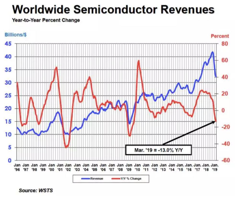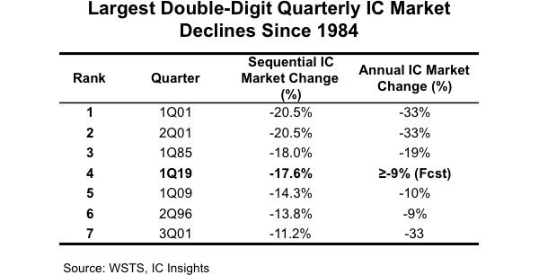 從去年開始,“半導(dǎo)體寒冬”幾個字口口相傳,業(yè)內(nèi)記者編輯們在參加采訪活動時經(jīng)常會問起這個問題,我甚至會惡趣味地伸長脖子,等待廠商口中冒出一點悲觀字眼,以供我組織一篇震驚體。往往會有所失望,大家非常謹慎。話題持續(xù)到了現(xiàn)在,機構(gòu)們又用數(shù)據(jù)具體呈現(xiàn)了悲觀的程度。印象中最深刻的兩組數(shù)據(jù)分別來自世界半導(dǎo)體貿(mào)易統(tǒng)計協(xié)會(WSTS)和ICinsights,前者說2019Q1半導(dǎo)體銷售額同比下降13%,環(huán)比下降15.5%。后者說2019Q1的衰退幅度是自2001年以來統(tǒng)計資料中衰退幅度最大的。
