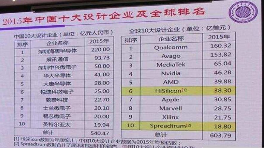 下面這張圖來自“2016年中國(深圳)集成電路創(chuàng)新應(yīng)用高峰論壇” 上清華大學(xué)微納電子學(xué)系教授魏少軍的一張PPT。2015年的中國10大設(shè)計企業(yè)中,展訊通信排第二,銳迪科排第六,前后相望。