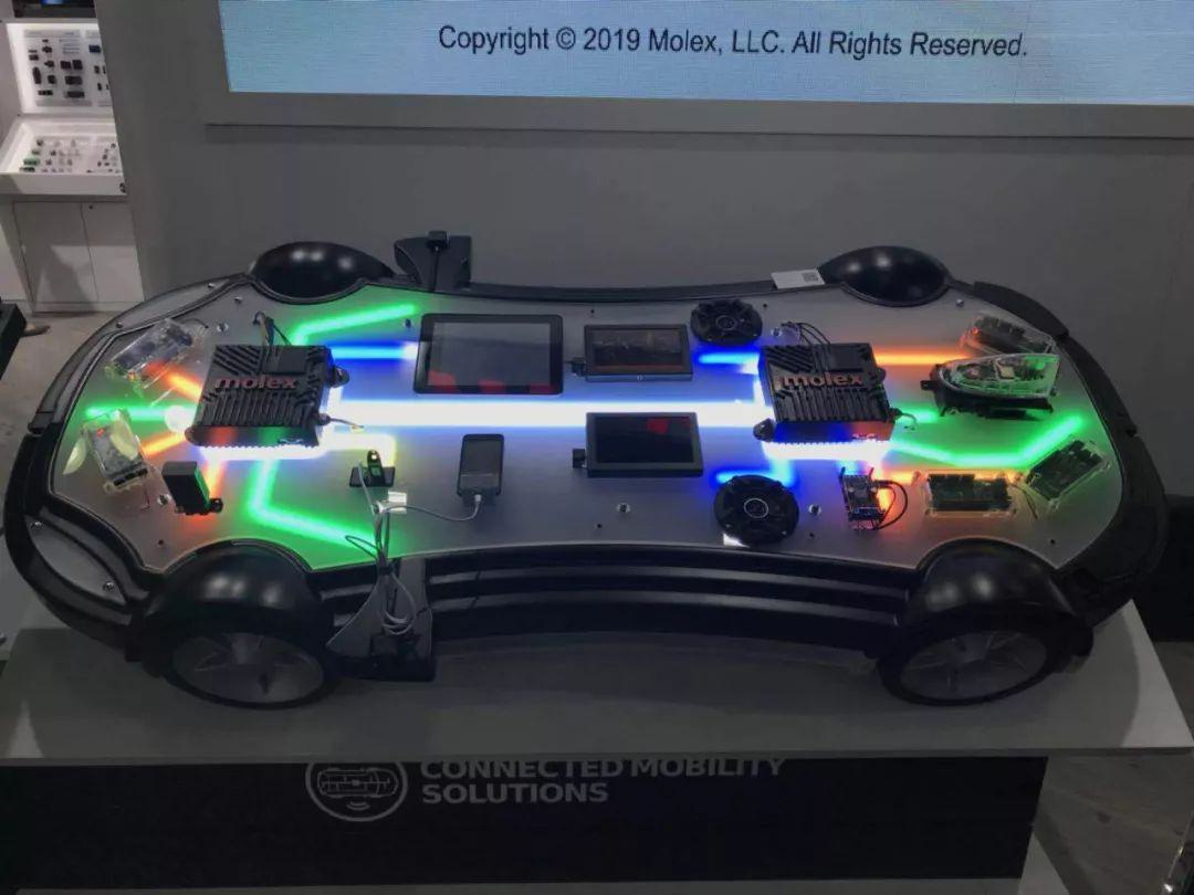 不管是技術(shù)發(fā)展趨勢(shì),還是客戶要求,如今電子產(chǎn)品空間寸土寸金,而留給連接器廠商的“空間”明顯不多了?!白冃 庇袝r(shí)候只是結(jié)果,能帶來(lái)更多技術(shù)的提升才是真正需要做的。就譬如,Molex在展區(qū)占據(jù)不小位置的汽車主題中,直接搬來(lái)了一個(gè)模擬汽車底盤(pán)。前后兩個(gè)網(wǎng)關(guān)將車內(nèi)主線都集中于此,整合各類模組。一方面是變小了,而真正帶來(lái)的卻是高速、智能和集成化的變化。(如下)
