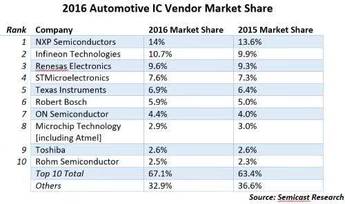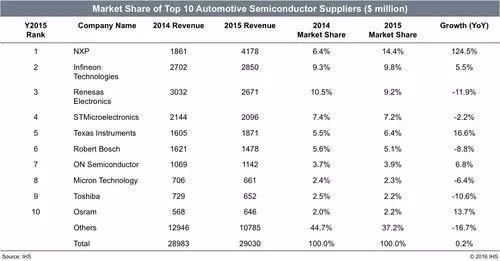 200億美元在2016年汽車新聞(Automotive News)百大汽車零部件供應(yīng)商中可排在第10名,第二大車載半導(dǎo)體廠商英飛凌在這個(gè)榜單中排在第89位。(注:汽車新聞榜單相當(dāng)隨性,對(duì)電子元器件供應(yīng)商統(tǒng)計(jì)很不完整,車載半導(dǎo)體領(lǐng)域只有英飛凌入選,但可以做為一個(gè)參考。)