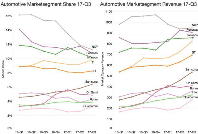 所以,三星半導(dǎo)體進(jìn)不了Semicast Research榜單前十就可以理解。不過按半導(dǎo)體商業(yè)情報(bào)的統(tǒng)計(jì),三星半導(dǎo)體在2016年已經(jīng)進(jìn)入全球前十。讓競(jìng)爭(zhēng)對(duì)手害怕的是,從2016年一季度,到2017年三季度,三星半導(dǎo)體車載業(yè)務(wù)連續(xù)9個(gè)季度增長(zhǎng),季營收從不到3億美元增長(zhǎng)到約5.5億美元,將近翻一番,市場(chǎng)份額也是連續(xù)9個(gè)季度增加。由于該機(jī)構(gòu)只對(duì)半導(dǎo)體廠商進(jìn)行統(tǒng)計(jì),所以應(yīng)該沒有計(jì)入哈曼業(yè)務(wù)。