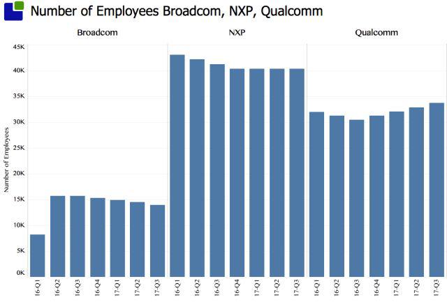 但如果收購高通之后,原博通雇員將屬于少數(shù)派。高通現(xiàn)在約有3萬3千人,恩智浦約有3萬1千人(恩智浦有工廠),而博通只有1萬5千多人,加起來約有8萬人,全球歷史上還沒有哪一家主營業(yè)務為芯片設計的公司有8萬名雇員??梢灶A想到如果收購成功,新博通的整合裁員,或許也將創(chuàng)出歷史記錄。