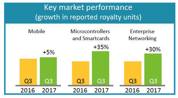 從半導(dǎo)體商業(yè)情報(Semiconductor Business Intelligence)提供的數(shù)據(jù)來看,也證實(shí)了這種趨勢,Arm權(quán)利金(Royalty)增長最快的是嵌入式應(yīng)用市場,2017年第三季度同比增長35%,而企業(yè)網(wǎng)絡(luò)市場增速也達(dá)到30%,但移動設(shè)備增速只有5%。